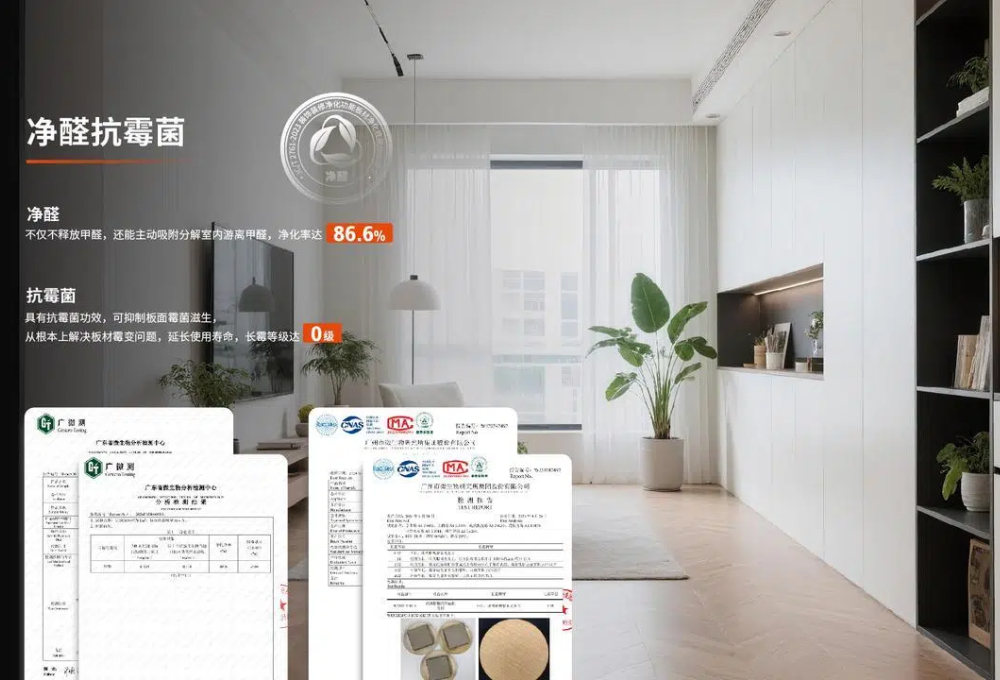 主动净醛黑科技:表面采用甲壳素吸附+纳米硅片分解技术,可净化室内其他来源(如窗帘、沙发)释放的游离甲醛,净化率高达86.7%,形成“自净+外净”双重防护
